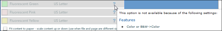 Sometimes a finishing option is unavailable because it is incompatible with another option that you selected. For example, if you selected color printing, your media/paper choices may be limited to those that are compatible with color printing. Move the pointer over the ? next to the unavailable option to see an explanation for its unavailability. You can then change your selections if necessary.