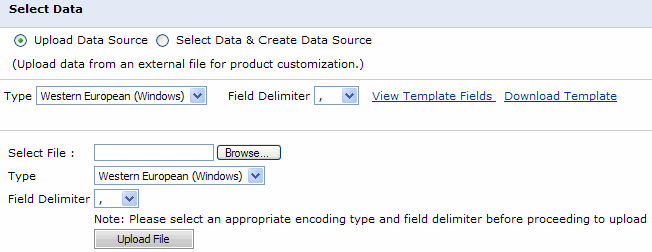 After you select or upload a data source you must make sure that the fields in the product template are mapped correctly to the fields in the data source so that the product includes the correct information.